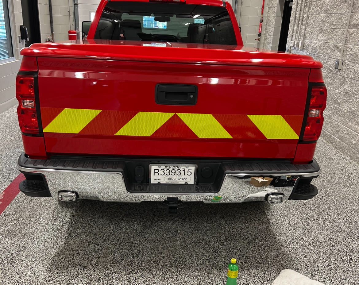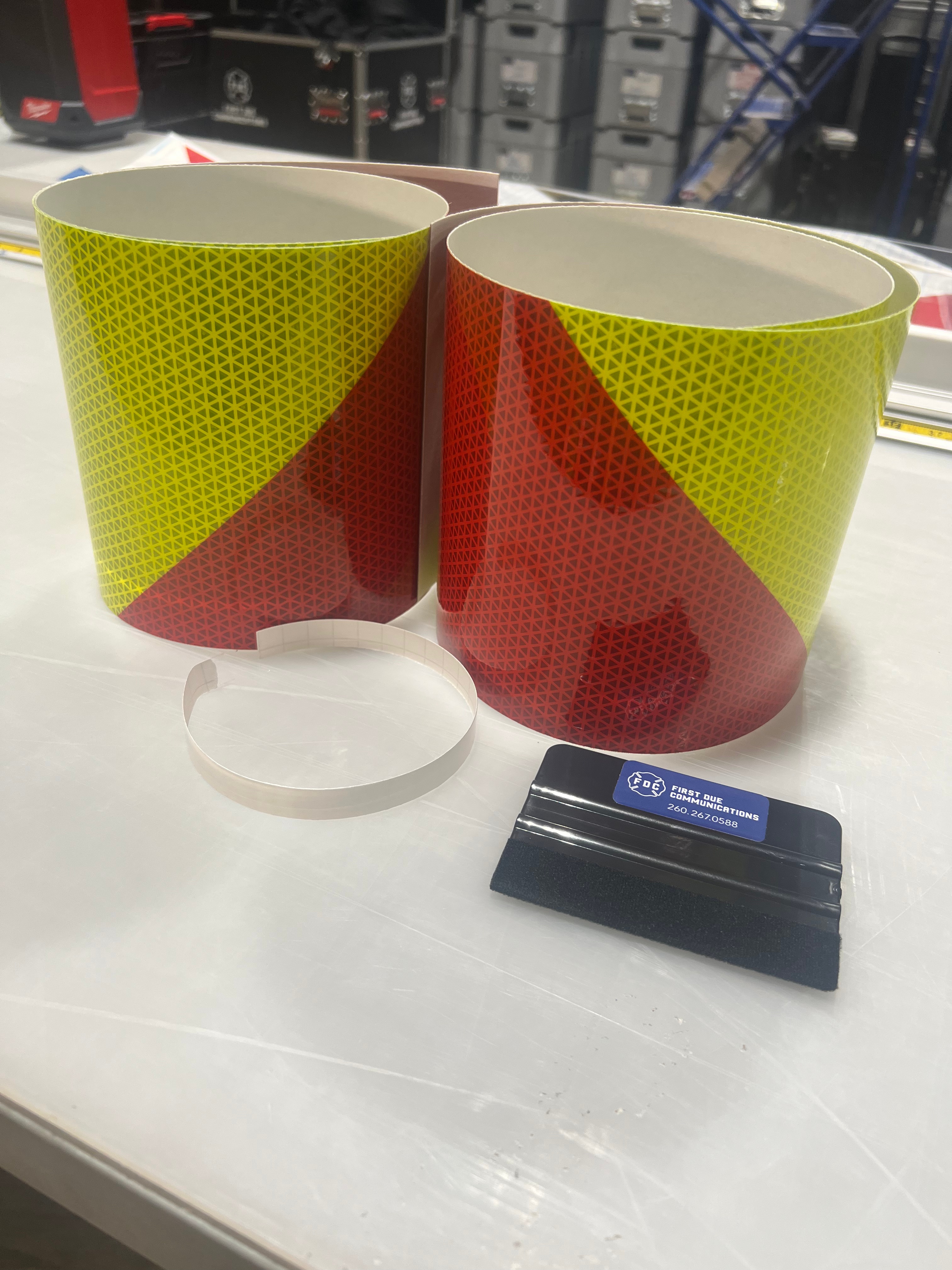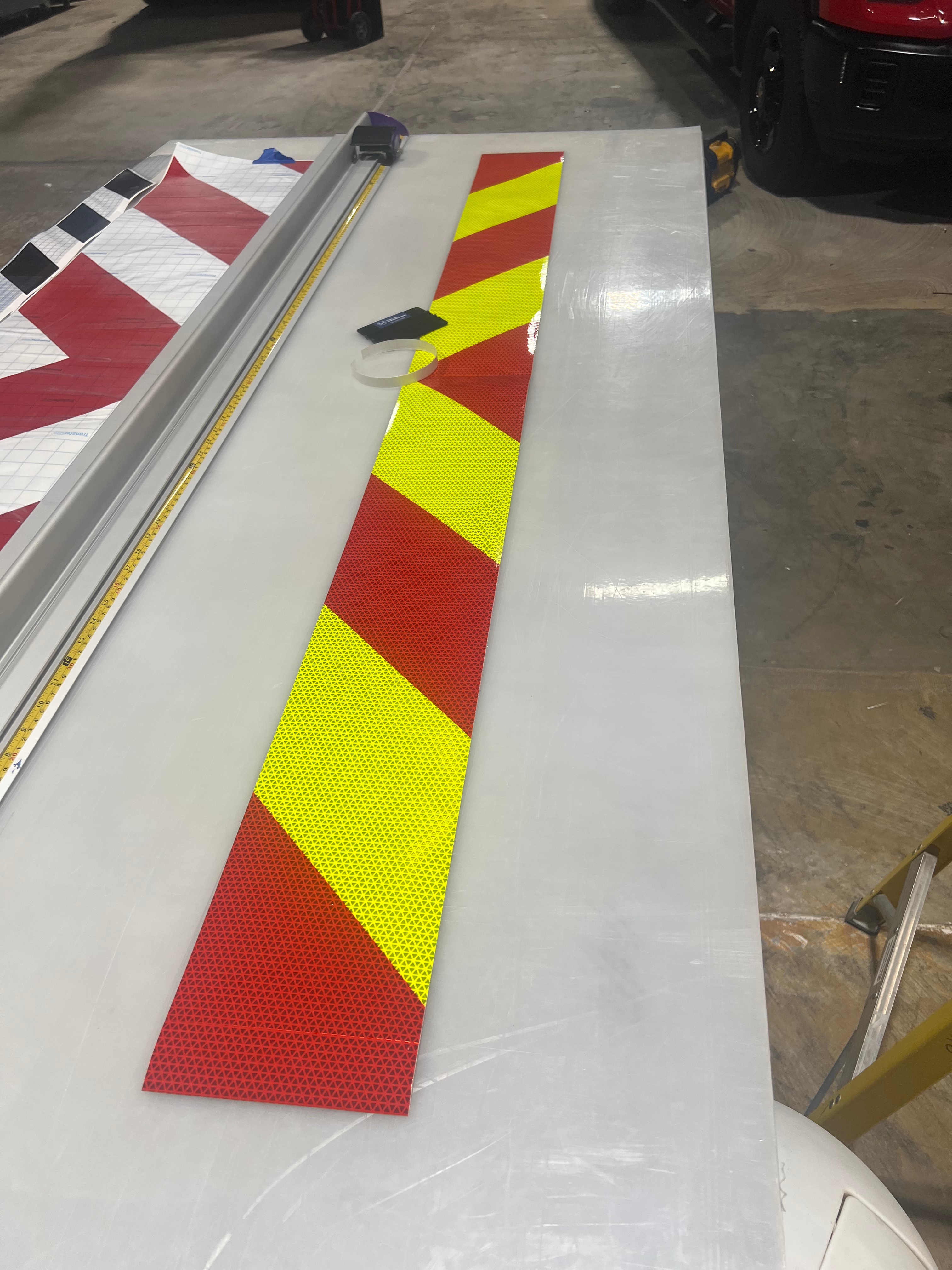When installed side-by-side, these two pieces create a 67″ long horizontal chevron panel in high-visibility lime and red. Oralite V98 High-Tack material is easy to trim with scissors or a precision cutting knife.